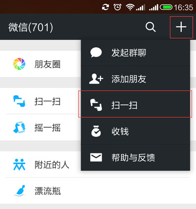 打開微信,在右上角+號功能選項中選擇 掃一掃